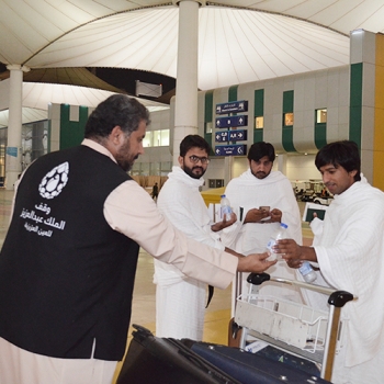 توزيع عبوات مياه شرب مبردة على المعتمرين والحجاج بساحات الحج والعمرة بمطار الملك عبد العزيز الدولي في مدينة جدة لموسم العمرة في شهر رمضان وموسم الحج